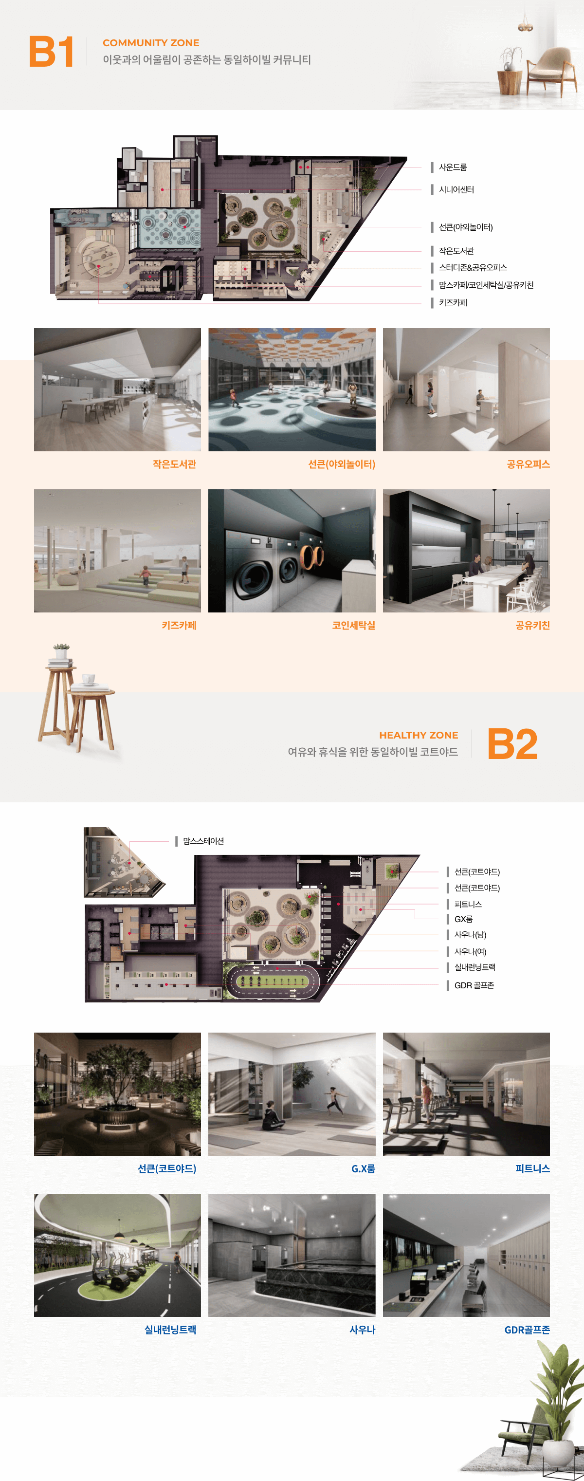 - 커뮤니티 시설의 구성, 설치, 개소, 규모 등은 각 단지별로 상이할 수 있으니 유의하시기 바랍니다.